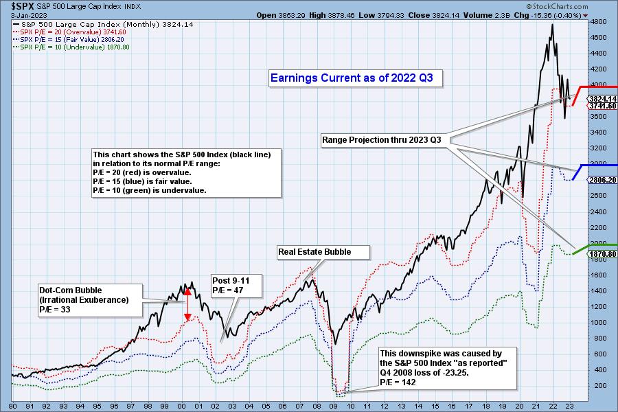 The table below shows earnings projections through September 2023 using GAAP earnings as the basis for the analysis. Keep in mind that the P/E estimates are calculated based on the $SPX close as of December 30, 2022. Keep in mind, the numbers will change daily depending on where the market goes from here. It is notable that the P/E is again outside the normal range.