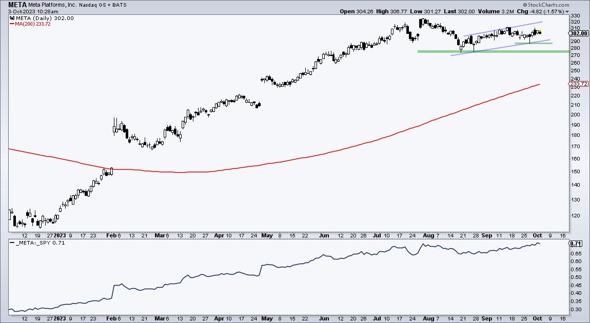 The first chart shows Meta Platforms (META) within a strong uptrend and well above its rising 200-day SMA. META fell in August and then rebounded the last six weeks. It remains above its August low and a leader. The blue lines mark a rising channel with support at 287. A break there would reverse this upswing and target a move toward the rising 200-day. META was featured in Chart Trader last week.
