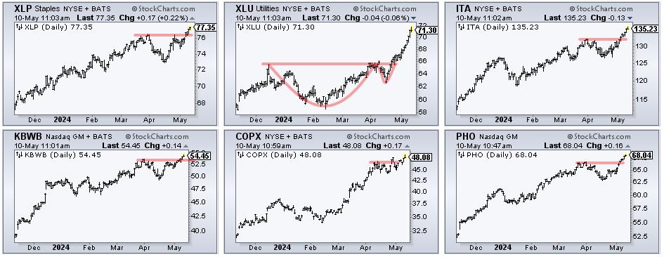 Current leaders include the Consumer Staples SPDR (XLP), Utilities SPDR (XLU), Aerospace & Defense ETF (ITA), KBW Bank ETF (KBWB), Copper Miners ETF (COPX), Infrastructure ETF (IFRA) and Water Resources ETF (PHO). The CandleGlance chart below shows all hitting new highs here in May. All six are also in clear uptrends.