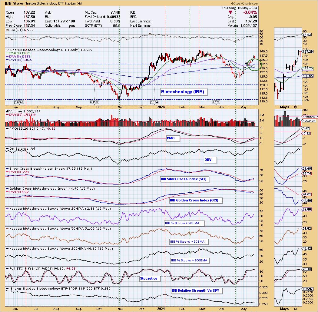 Conclusion: Biotechs saw a Silver Cross. The participation indicators under the hood are seeing improvement and primary indicators are bullish enough to look for some upside follow through.
