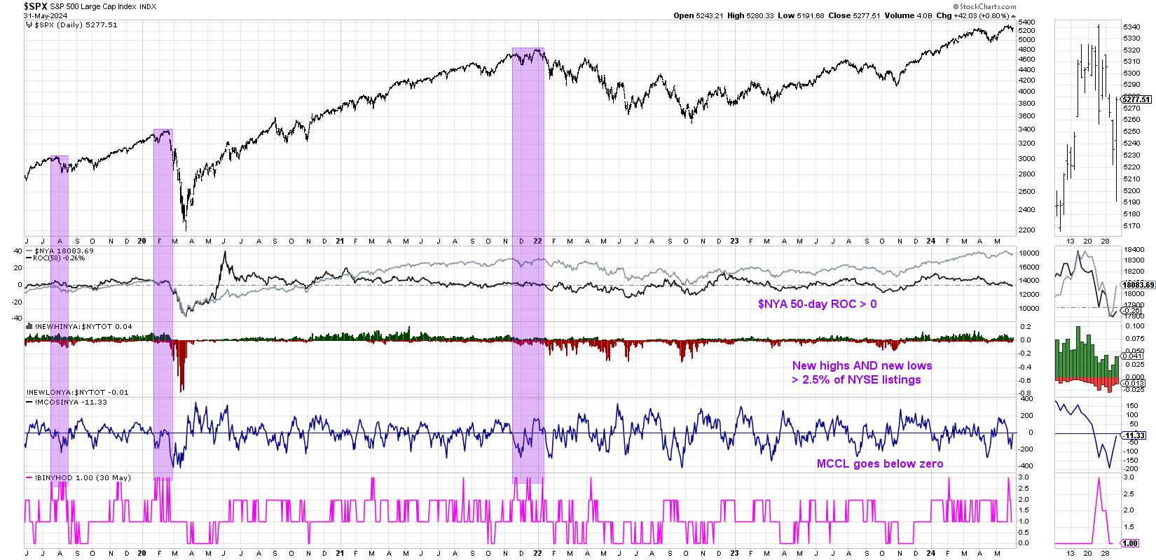 But Miekka's analysis showed that market tops are usually marked by indecision, and, by looking for a situation where there are a healthy number of both new 52-week highs and new 52-week lows, we can confirm this unstable market state. We can see in the chart that we saw 2.5% of new highs and new lows on the same day earlier in the month of May.