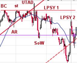 Preliminary Supply (PSY) warns of accelerating selling in uptrend. Watch for continuation of the uptrend.ReAccumulation, after the PSY, carries the index into a Gap and Buying Climax (BC). We draw a Resistance Line.Secondary Tests (ST) are rejected at BC Resistance. Reactions result in Lower Lows referred to as Signs of Weakness (SoW).Volatility and Gaps are manifesting on declines with expanding volume. Supply is overwhelming the index and increasing.Three Last Point of Supply rallies fail each at lower highs. Downtrend channel becomes evident while Distribution is still forming. This sets the stride of the impending decline.Markdown engulfs the $SPX Index. Volatility expands as prices fall.See the PnF study for estimates of downside price objectives for this intraday structure.ThrowUnder and OverSold below the bottom of the Trend Channel just as PnF count objectives are being fulfilled. Note the Selling Climax into the lower PnF objective. A Trifecta of Bullish conditions!Swing Accumulation Notes:
