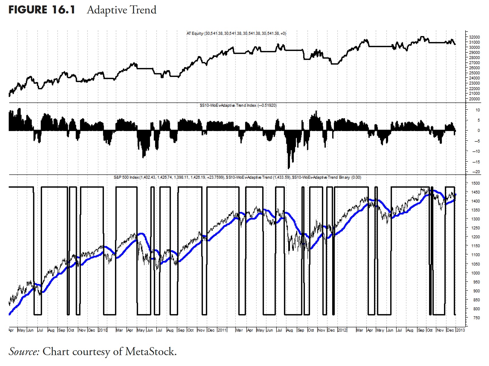 (Will) Thanks Greg, let me show you two different ways we approach indicators and systems. The system part will actually reference this, and your previous book on breadth and will fully disclose those indications. First, let me show you a specific trend following price indicator. This is a classic variation of common approaches. We call it "adaptive trend." Since it's proprietary, I can't tell the exact formula, but here is what it is: it is a midpoint moving average with a volatility-adjusted average true range band around it as a buy/sell trigger. As volatility and range expands, the lower-bound band tightens up for quicker exits, and the exact happens for smooth trends, low volatility and more "standard" ATR allows more investible flexibility. Our Adaptive Trend indicator averages about four to five trades per year while only being invested approximately 60% of the time, which annualizing a return of about 14 percent from 1971 to 2012 (versus 8 percent for the Nasdaq). It has a peak drawdown of 30 percent, and an Ulcer Index (risk) of 7.5, which is about 20% of the risk buy-and-hold carries with the Nasdaq Ulcer index of 35. Our results include no return on cash and do not factor in for trading costs or slippage. Based on our actual trading data using ETFs for many years, our actual costs vary between 10 and 20 basis points per year. Figure 16.1 shows the equity line in the top plot, the adaptive trend index in the middle plot and the S&P 500 with adaptive trend in the lower plot. The binary of the signals is overlaid on the S&P 500 in the lower plot. You can clearly see it does an excellent job of picking market turns.