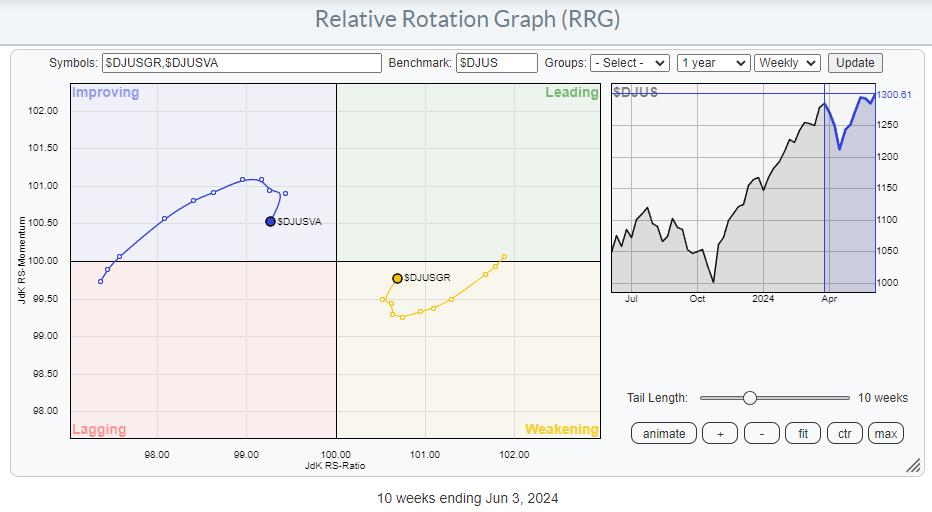 By splitting the growth and value segments into their respective size segments, we can see a more granular rotation that combines the two ways of dividing the stock market on one RRG.