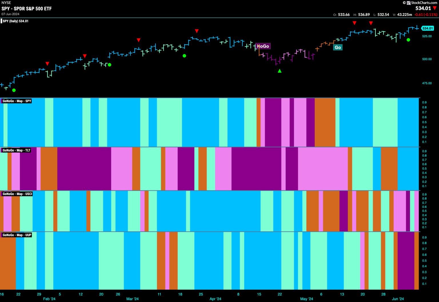 Good morning and welcome to this week's Flight Path. Equities rebounded this week as we saw a string of strong blue "Go" bars and price hit a new higher high. Treasury bond prices returned to a "Go" trend with their own week of strong blue bars. Commodities struggled again as GoNoGo Trend was unable to maintain "Go" colors. The dollar shows uncertainty at the end of the week with an amber "Go Fish" bar.