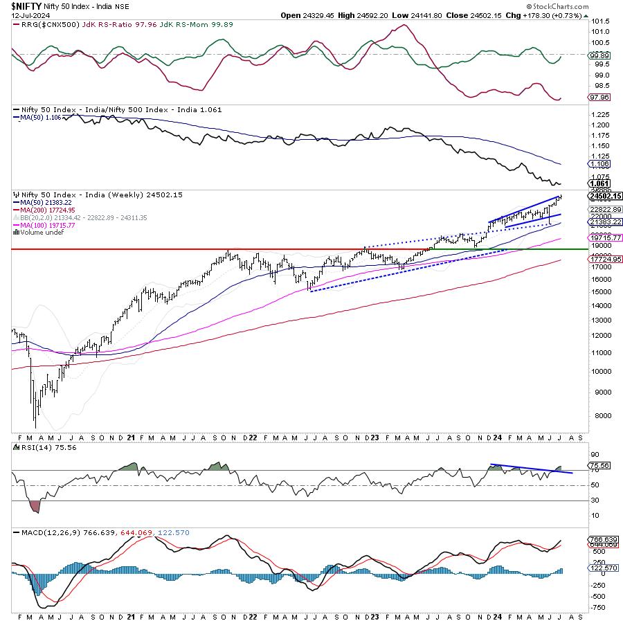 The coming week is truncated, with Wednesday being a trading holiday because of Moharram. The markets are in a firm uptrend; the options data suggests the potential resistance points shifting higher towards 24700-24800 levels. The level of 24500 will also be a crucial level to watch and Nifty's behavior vis-à-vis that level will dictate the index's behavior over the immediate short term. While there is no dispute about a strong uptrend, the markets stay significantly deviated from their mean; this makes it necessary to lay an equal emphasis on guarding profits at higher levels and effectively rotating the stocks to stay invested in the ones with strong relative strength and promising technical setups.The weekly RSI is 75.86; it remains in the overbought territory. It stays neutral and does not show any divergence against the price. The weekly MACD is bullish and it stays above its signal line.