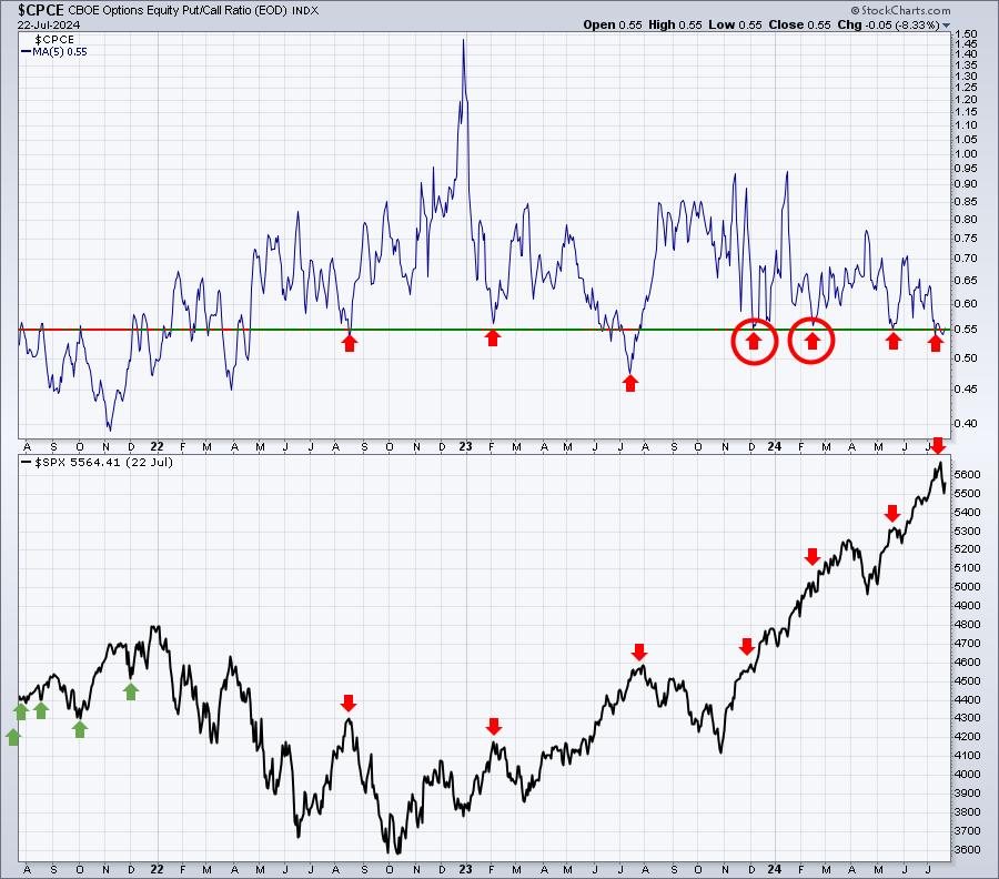 Next, how about the reversal just as the 5-day SMA of the equity only put call ratio ($CPCE) hit a key complacency level that tends to mark tops?