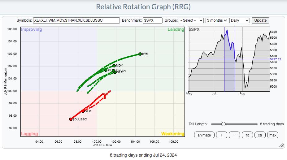 Financials (XLF), industrials (XLI), small caps (IWM), mid caps (MDY), and transports ($TRAN) were all poised to benefit from a change in Fed policy and the beginning of rate cuts. But Fed Chief Powell announced, and botched the announcement, in my opinion, with no rate cut and mentioning that a potential rate cut would be "on the table" for September. Now, I say "botched", because the FOMC minutes came out two weeks later and the minutes suggested an upcoming rate cut was likely. "Likely" and "on the table" are not the same to me, but maybe others interpret it differently. Anyhow, that Fed announcement reversed the strength that we had seen in the groups mentioned earlier in July. Here's how that RRG looked after the Fed announcement and leading up to Powell's Jackson Hole address: