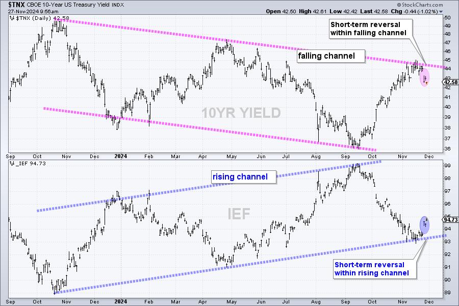 These two caught my eye because they reversed the swings within their respective channels. $TNX fell sharply to reverse the upswing, which extended from mid September to mid October. This means the short-term trend (down) is now aligned with the long-term trend (down). On the flip-side, IEF surged and reversed its downswing. This means the short-term trend (up) is now aligned with the long-term trend (up).