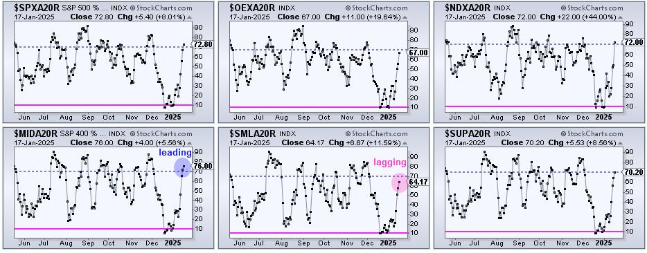 The CandleGlance charts above show the percentage of stocks above their 20-day SMAs for the S&P 500, S&P 100, Nasdaq 100, S&P MidCap 400, S&P SmallCap 600 and S&P 1500. We can identify the leaders and the laggards by comparing values. Mid-caps are leading as S&P MidCap 400 Percent Above 20-day SMA ($MIDA20R) surged to 76 percent (blue circle), the highest of the six. This means 76 percent of its component stocks are above their 20-day SMAs. This is a big change because this number was below 10% in mid December. Small-caps are lagging as $SMLA20R finished at 64.17 percent (pink circle). Everything else is in between.
