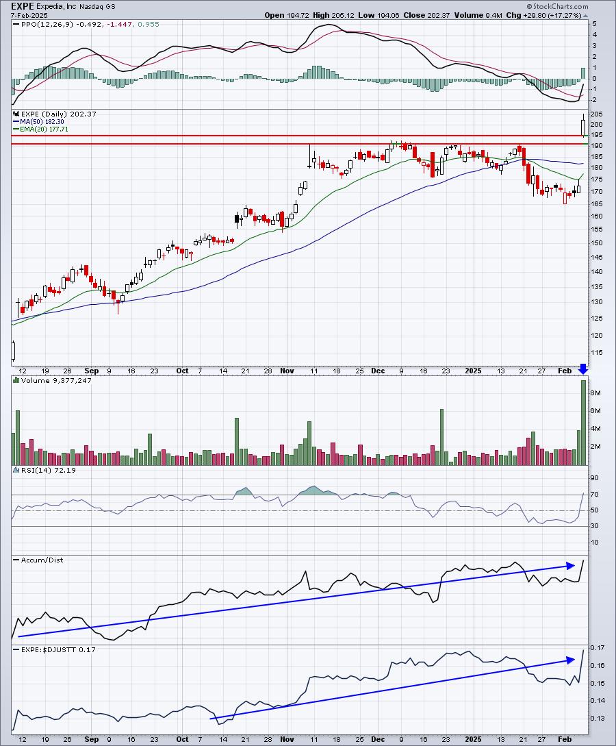 EXPE now has excellent support in the 191-195 zone, in my opinion. 191 was the price resistance prior to Friday's gap higher and 195 (actually 194.72) was the gap opening on Friday on over 8 million shares, its 3rd largest volume day of the past year. Booking Holdings (BKNG) is set up to potentially do the same - report blowout numbers and soar to all-time highs - when it reports its quarterly results on Thursday, February 20, 2025.