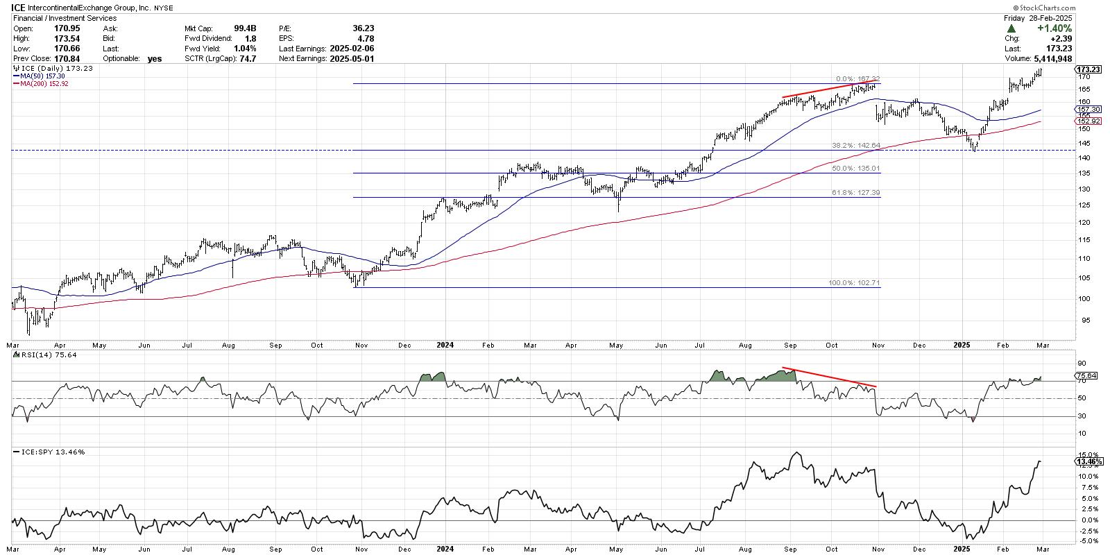 When the broad indexes start to falter, it can often be a great exercise to focus on stocks managing to pound out further new highs.  While we often think of the financial sector as banks and regional banks, IntercontinentalExchange Group (ICE) is part of the exchanges subgroup and achieved a new all-time high again this week.